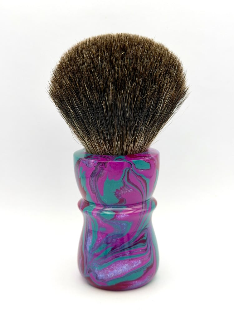 This is a hand turned and finished Resin shave brush handle. This comes with our new coin.
